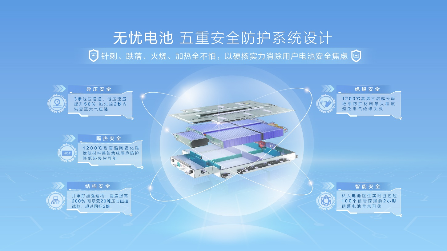 超高的安全性表现,源于“无忧电池”在设计之初就将安全第一作为底层逻辑,通过结构安全、导压安全、隔热安全、绝缘安全、智能安全五重安全防护系统设计能为用户带来更全面的行车安全保障,并在云端大数据平台的检测下,通过“车+云”的大数据协同,私人电池医生可以对每一辆车的电池系统进行全天候管理,让用户真正做到用车无忧。